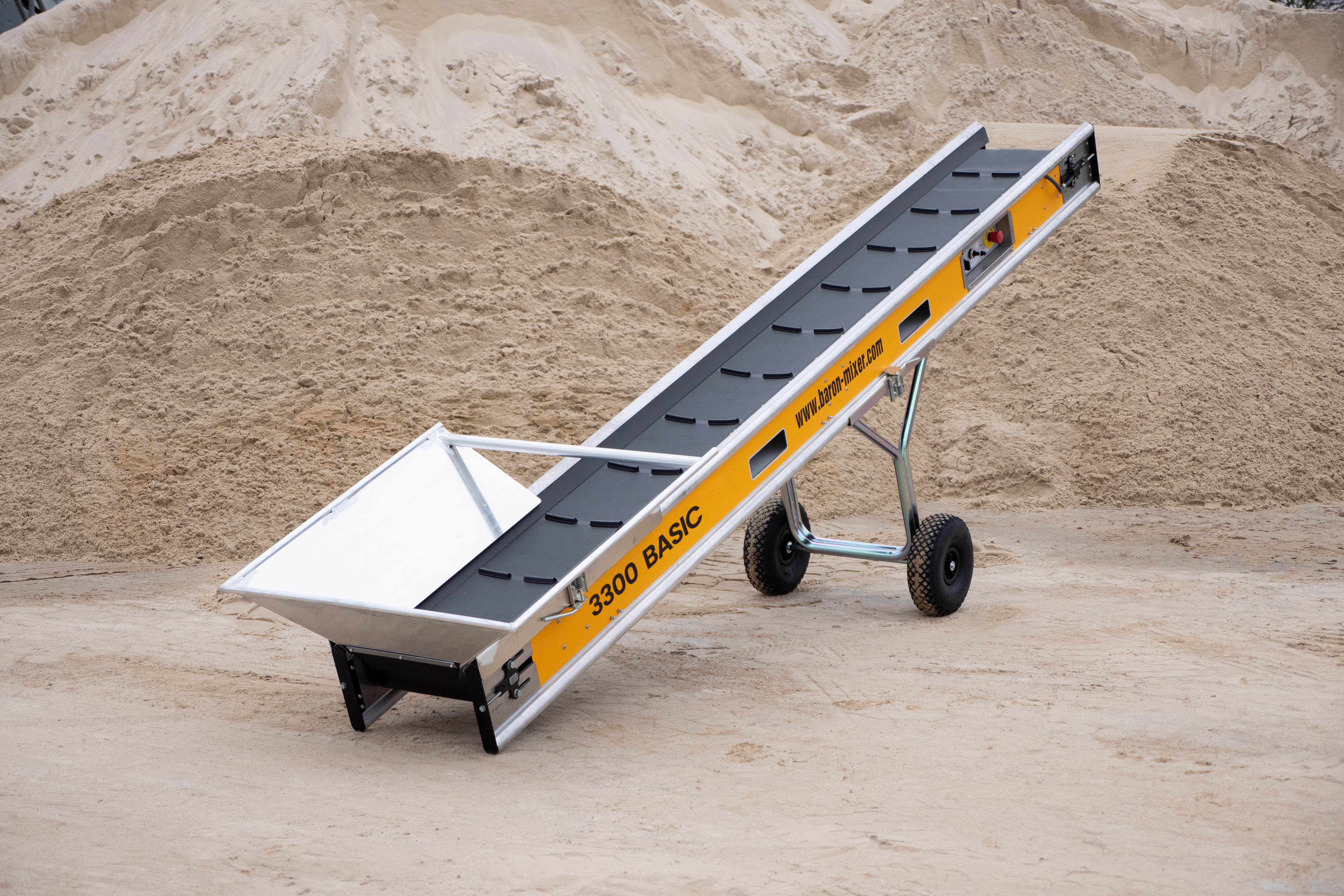 The Baron 3300 Basic conveyor is hard-wearing and can be used for all types of materials from demolition debris to wet mortar and soil. The closed side profile provides an extremely high load capacity while offering a maximum degree of safety. The conveyor is shown with the feeding box and undercarriage, which must be bought separately.